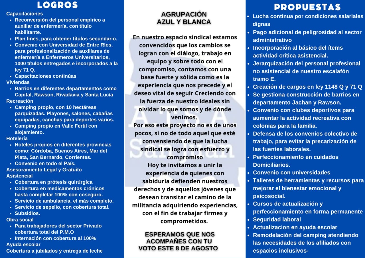 Con una mirada puesta en el futuro, pero con los pies bien firmes sobre las bases construidas, la Agrupación Azul y Blanca se presenta como una opción confiable, comprometida y en constante movimiento. “El 8 de agosto esperamos tu voto para seguir defendiendo juntos la dignidad de cada trabajador de la sanidad”, afirmaron.
