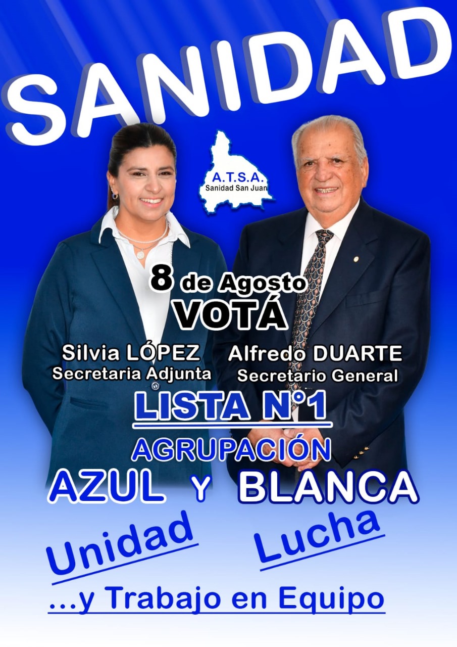 Con una firme convicción de que el sindicalismo se construye con diálogo, esfuerzo y unidad, la Lista 1 Agrupación Azul y Blanca se prepara para participar en las elecciones gremiales de ATSA San Juan, que se llevarán a cabo el próximo 8 de agosto. Encabezada por Alfredo Duarte como candidato a Secretario General y Silvia López como Secretaria Adjunta, esta agrupación reafirma su compromiso con los trabajadores de la sanidad y presenta una propuesta que conjuga experiencia, logros concretos y un fuerte impulso de renovación.