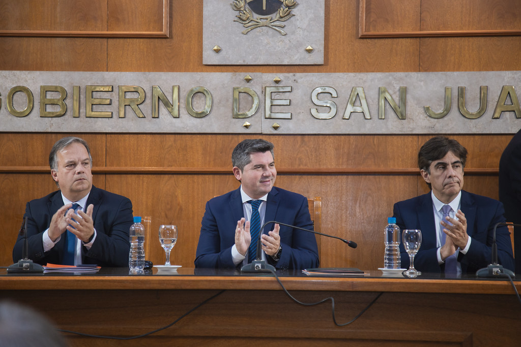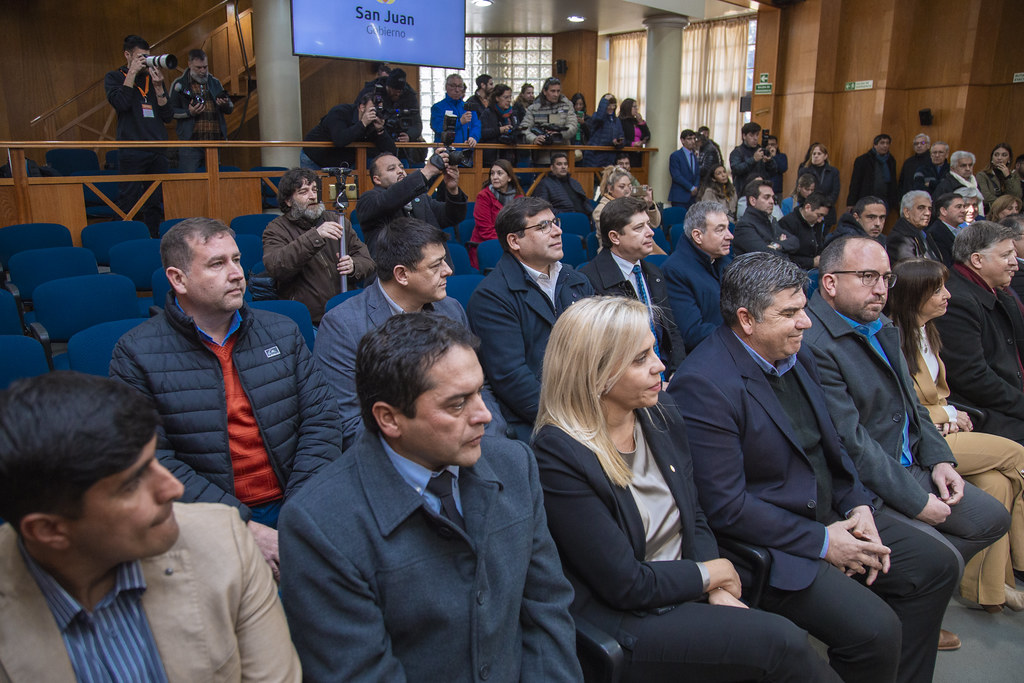 Acompañan al gobernador, Marcelo Orrego, los diputados nacionales Nancy Picón, Walberto Allende, intendentes municipales, Juan Carlos Abarca, intendente de Albardón, José Castro, intendente de Angaco, Sebastián Carbajal, Calingasta, Susana Laciar, intendenta de Capital, Romina Rosas, de Caucete, Daniela Rodríguez, de Chimbas, Jorge Espejo, el intendente de Iglesia, Horacio Espejo, de Jáchal, Eduardo Banegas, de 9 de Julio, Fabián Aballay, de Pocito, Carlos Munisaga, de Rawson, Sergio Miadowski, de Rivadavia, Analía Becerra, de San Martín, Juan José Orrego, de Santa Lucía, Alfredo Castro, de Sarmiento, Hugo David Domínguez, de Ullum, Mario Riveros, de Valle Fértil, Rodolfo Jalife, de 25 de Mayo y Juan Atámpiz, de Zonda.